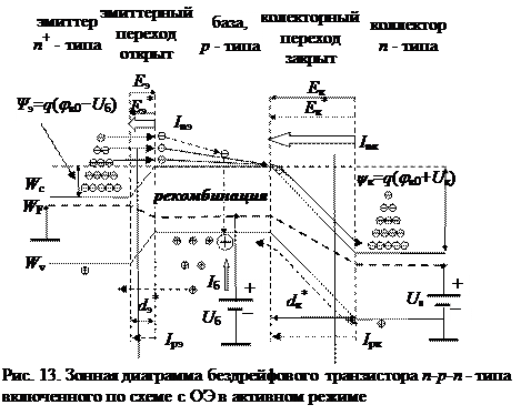 На рис.13 приведена зонная диаграмма бездрейфового транзистора n - p - n - типа, включенного по схеме с ОЭ в активном режиме. В этой схеме эмиттер заземлен. Напряжение U б смещает эмиттерный переход в прямом, а напряжение U к смещает коллекторный переход в обратном направлении. Электроны из эмиттера через понизившийся потенциальный барьер Ψ э0= q (j к0− U б) поступают в базу. Диффундируя через “тонкую” базу, меньшая часть электронов рекомбинирует с дырками, создавая небольшой базовый ток I б. Большая часть электронов достигает коллекторного перехода и через обратносмещенный коллекторный переход, открытый для неосновных носителей, уходит в коллектор, создавая электронный ток коллектора I nк.