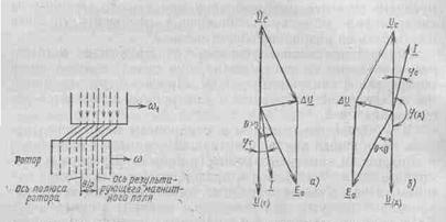 На рис. 2 даны две векторные диаграммы, одна из которых (рис. 2, а) соответствует режиму работы генератора параллельно с сетью, а другая (рис. 2,6) — двигательному режиму. На рис. 2, а ротор опережает результирующее поле (Е 0 опережает U (г)), а на рис. 2,6 отстает от него (Е 0 отстает от U( Д)). Под U (г) и U( Д) понимаются напряжения на выводах машины, уравновешивающие напряжения сети U (г)=— U C и U( Д) =— U C.