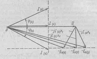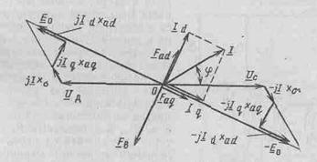 Диаграмма по уравнению (2) построена в правой части рис. 3, причем для опережающего тока якоря. На рис. 3 показаны векторы МДС обмотки возбуждения и составляющих реакции якоря.