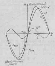 На рис. 5 показана угловая характеристика M=f(θ) для двигательного режима (нижняя часть). Для сопоставления там же приведена аналогичная характеристика для генератора. Утолщенная часть кривой соответствует устойчивой части характеристики. Величина МMAX характеризует перегрузочную способность машины. Отношение МMAX / МHOM называется кратностью максимального момента. Согласно ГОСТ 183-74 эта кратность должна быть не менее 1,65. Из (4) видно, что МMAX в синхронных двигателях прямо пропорционален подводимому напряжению U и ЭДС E 0. Это относится как к неявнополюсному двигателю, так и с некоторым приближением к возбужденному явнополюсному двигателю, так как у последнего МMAX определяется главным образом первой составляющей. Зависимость M=f(θ), представляющая собой угловую характеристику синхронного двигателя, является его механической характеристикой. При номинальной нагрузке θ HOM=20÷300.