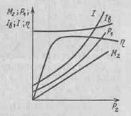 Рабочие характеристики синхронного двигателя могут быть получены или при I B=const, или при cos φ = const. На рис..8 показаны рабочие характеристики М, I B, Р 1, I, η=f(P2) при условии U=const и cos φ =cos φHOM=const.