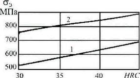 Рис. 7.6. Зависимость прочности от твердости термически обработанного чугуна: