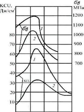 1 — после закалки и отпуска; 2 — после изотермической закалки.