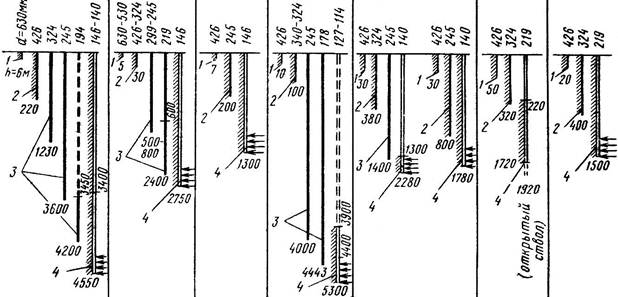 В зависимости от геологических условий, состояния техники и технологии бурения, глубины скважины и ее назначения скважину можно крепить одной или несколькими колоннами с различной высотой подъема цементного раствора за каждой колонной (см. рис. 1.1).