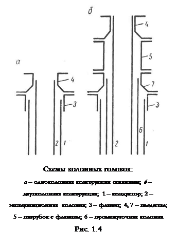 Оборудование устья скважины состоит из колонной головки и предназначено для подвешивания обсадных колонн, герметизации и разобщения межколонных пространств, установки противовыбросового оборудования (в процессе бурения) и фонтанной арматуры (в процессе эксплуатации). В зависимости от конструкции устье скважины может быть оборудовано различными способами (рис.1.4).