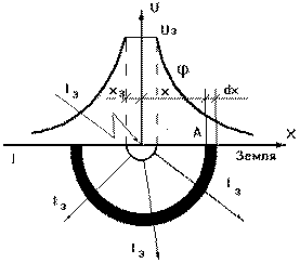 При протекании тока на элементарном участке dx (рис. 11.2) создается падение напряжения dv (принят полусферический заземлитель).