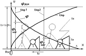 (практически Х = 20м) напряжение прикосновения имеет наибольшее значение (точка А, рис. 11.2) UПР=