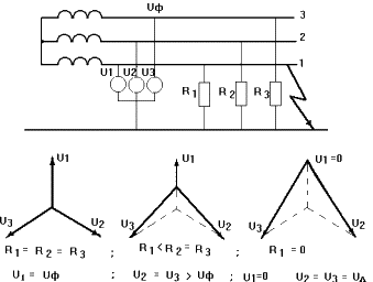 - Замыкание на высокой стороне. Пробивной предохранитель П отсутствует. При замыкании напряжение между нейтральной точкой и землей будет равно