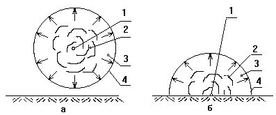1 - центр взрыва; 2 - газообразный продукт взрыва; 3 - зона сжатого воздуха; 4 - фронт ударной волны