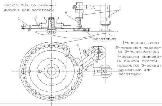 Для загрузки сложных по форме предметов обработки (деталей или узлов), которые в силу сцепляемости нельзя располагать вплотную (например, стеклянные ножки вакуумных приборов), целесообразно применять МЗУ c расположением транспортируемых элементов в гнездах, поворотной сменной кассеты 1, выполняющей функцию магазина, рис.2.5. Дискретный привод поворота кассеты выполнен в виде храпового механизма с поступательно движущемся от внешнего привода храповиком 4 (время срабатывания храпового механизма не более 1,5секунды). Питатель 3 выполнен в виде манипулятора с вакуумным захватом 5, и действует по жесткой программе синхронно с работой технологической машины (в частности, полуавтомата заварки ножек ЭВП).Сменность кассет позволяет сократить вспомогательное время на загрузку МЗУ. Число гнезд в кассете на действующем оборудовании –50, если те же гнезда расположить по спирали, задав манипулятору дополнительное перемещение, вместимость магазина может быть увеличена до 200 единиц.