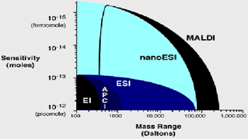 MALDI и ESI сейчас являются самыми распространёнными способами ионизаций для биомолекулярной масс-спектрометрии, с их превосходными диапазонами масс и чувствительностью (рис. 1).