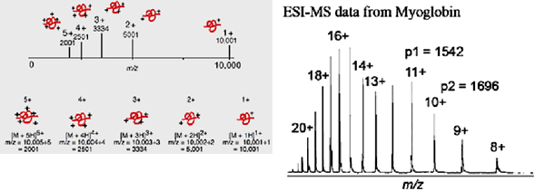 Например, белок с массой 10000 дальтон и его масс-спектр с зарядами до +5 показаны на рис.Механизм ионизации белка − протонирование, что не только добавляет заряд, но также увеличивает массу белка на число добавленных протонов. Масса белка и отношение m/z меняется в зависимости от числа зарядов на белке. Подобные закономерности характерны и для других процессов катионизации, например, с Na+ и Cs+.