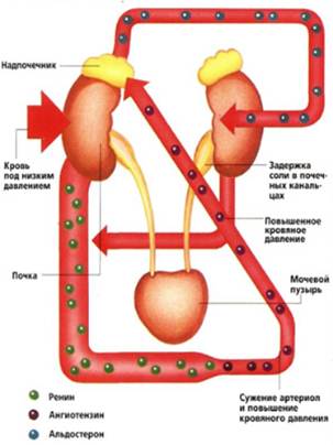 Стресс приводит к гиперкатехоламинемии (повышению в крови уровня адреналина и норадреналина). Это ведёт к высокому сердечному выбросу, спазму сосудов (росту периферического сопротивления). Высокая активность симпатической нервной системы стимулирует высвобождение в почках ренина (фермента, образующегося в ЮГА почек). Ренин переводит ангиотензиноген в ангиотензин I, который превращается в ангиотензин II под влиянием ангиотензинпревращающего фермента (АПФ). Ангиотензин II стимулирует секрецию альдостерона (гормона надпочечников) и вазопрессина (антидиуретического гормона, образующегося в гипоталамусе. Под их влиянием усиливается реабсорбция натрия и воды в почечных канальцах и снижается ребсорбция калия. Задержка в организме воды и натрия ведёт к отёку стенки сосудов, повышению ОЦК (эти факторы ещё более повышают АД). Ангиотензин II вызывает гипертрофию миокарда, мышечной оболочки артерий, в том числе, почек, это ведёт к склерозу миокарда, сосудов, почек, что ещё более повышает АД. В патогенезе большая роль отводится истощению активности депрессорной системы почек (снижению синтеза вазодилятирующих простагландинов), что приводит к стабилизации высокого АД.