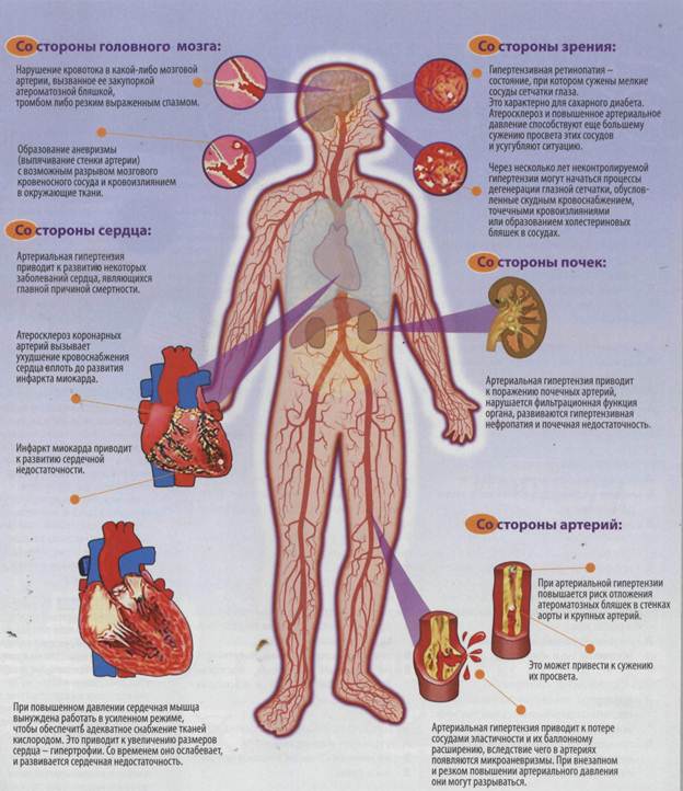 При длительной артериальной гипертензии стенки артерий утолщаются, становятся ригидными, извитыми, удлиняются, суживается их просвет – развивается гипертоническая дисциркуляторная энцефалопатия. Из-за хронического нарушения питания мозга развиваются деменция, паркинсонизм, нарушение памяти, шум, тяжесть в голове, пошатывание при ходьбе, недержание мочи, эмоциональная лабильность, депрессия. Острые проявления церебральной патологии: