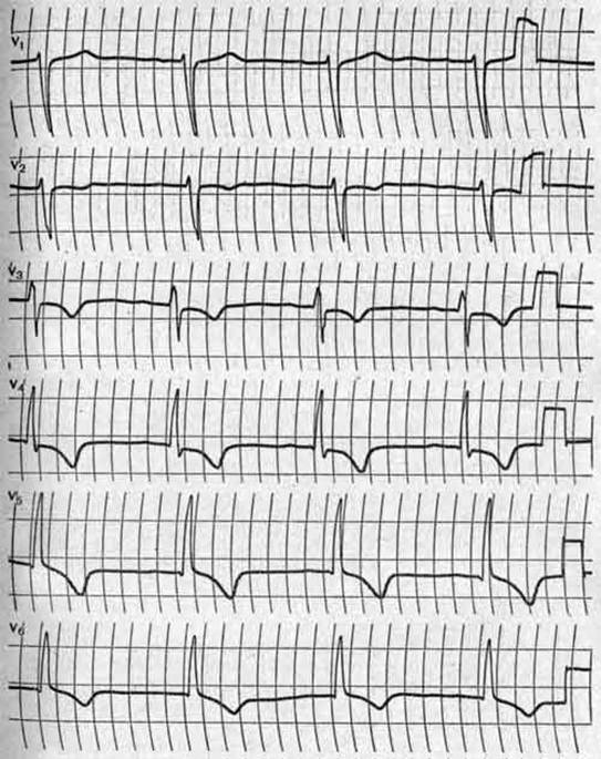 - Во всех грудных отведениях от V1 до V6 комплекс QRS имеет вид rS или RS с выраженным зубцом S.