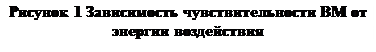 Чувствительность ВМ к механическим воздействиям определяют в основном с помощью копров. Принцип действия копров основан на сбрасывании грузов с разной высоты на ВВ, помещенное на наковальню или зажатое под определенным давлением (ударное трение). Так как взрыв-процесс вероятностный, то полученные результаты характеризуют частостью взрыва, т.е. количеством взрывов в процентах. Частость взрыва в зависимости от энергии воздействия может меняется от 0 до 100%. Типичная зависимость чувствительности ВМ от энергии воздействия представлена на рисунке 1.