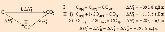 Например, весьма сложно определить теплоту образования сложных химических соединений. Но если сжечь это вещество и замерить теплоту сгорания, то, зная продукты сгорания и теплоты их образования, можно очень точно рассчитать теплоту образования вещества.