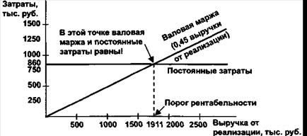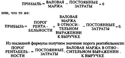 Порог рентабельности — это такая выручка от реализации, при которой предприятие уже не имеет убытков, но еще не имеет и прибылей. Валовой маржи в точности хватает на покрытие постоянных затрат, а прибыль равна нулю.