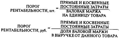 Порог рентабельности товара — это такая выручка от реализации, которая покрывает не только переменные и прямые постоянные затраты, но и отнесенную на данный товар величину косвенных постоянных затрат. При этом прибыль от данного товара равна нулю.