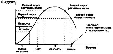 Считается разумным располагать (планировать) прохождение первого порога безубыточности где-то на уровне второй трети фазы роста. Но расчет момента снятия с ассортимента требует большей точности, совмещения с коммерческими, техническими и трудовыми аспектами политики предприятия, а также — и, возможно, это главное — учета общей стратегической линии предприятия. Товар, не имеющий коммерческих перспектив, находящийся в фазе упадка, должен быть изъят из ассортимента как только этот товар становится неспособным покрывать своей выручкой прямые переменные и прямые постоянные затраты, или, иначе говоря, как только промежуточная маржа становится отрицательной.