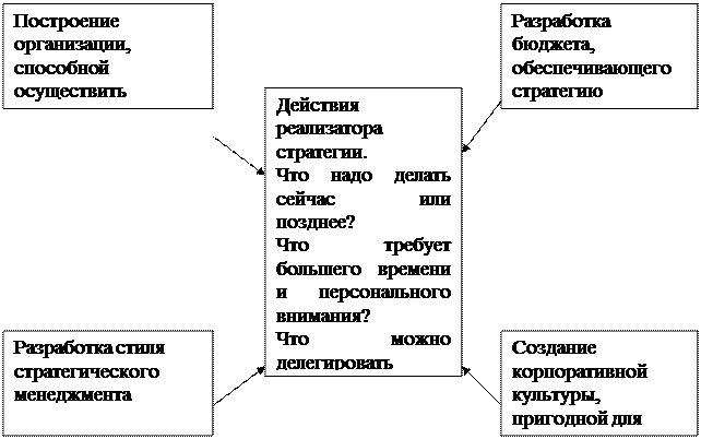 Когда стратегический план разработан перед менеджером стоит задача превратить его в действия и хорошие результаты. Если разработка стратегии прежде всего предпринимательская деятельность, то ее реализация - внутренняя административная деятельность. Детали такой деятельности зависят от конкретной ситуации.