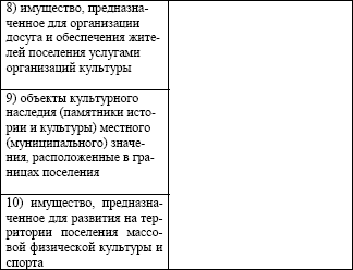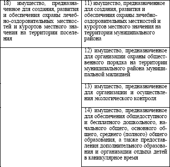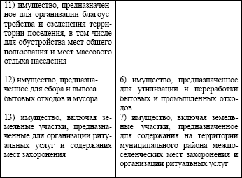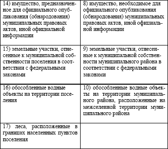 С вступлением в силу Закона о местном самоуправлении (2003) в Российской Федерации появляются несколько видов муниципальных образований, каждый из которых реализует свойственные именно ему вопросы местного значения. В силу этого Закон отдельно закрепляет перечень муниципального имущества, которое может находиться в собственности поселений, муниципальных районов и городских округов (табл. 1).