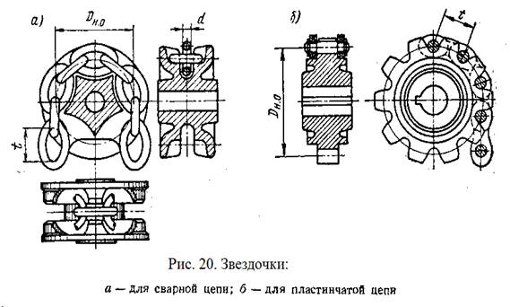 Звёздочки для пластинчатых цепей изготавливают из проката или литой стали, они представляют собой как бы зубчатые колёса, зубья которых входят между пластинами цепей, соприкасаясь с валиками шарниров (рис. 20б).