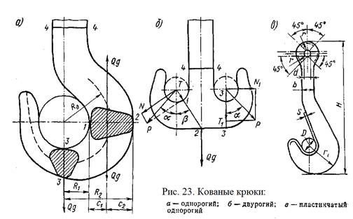 Груз прикрепляется к этим приспособлениям при помощи канатных или цепных строп, или при помощи специальных захватов, подвешиваемых на крюк или петлю. По форме крюки бывают однорогие и двурогие (0,25-100 т), а при грузоподъемности до 320 т – пластинчатые (рис 22). Крюки изготавливаются кованные и штампованные из низкоуглеродистой стали.