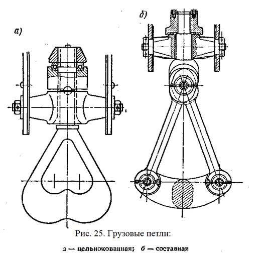 Кроме грузовых крюков, в грузоподъемных машинах применяются цельнокованые (рис. 25а) и составные (рис. 25б) грузовые петли. Форма и размер петель не стандартизованы и поэтому требуется обязательное проведение расчета их на прочность.