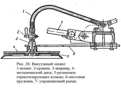 При выполнении подъемной операции диск накладывается на поверхность груза и включается насос, откачивающий воздух (рис. 28). Резиновое кольцо предотвращает проникновение воздуха между плоскостями диска и груза. Откачивается воздух и из резервного резервуара, поэтому в случае аварийной остановки насоса под контактными дисками сохраняется вакуум, позволяющий держать поднятый груз.