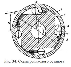 Фрикционные остановы обеспечивают более плавную остановку вала. Бывают роликовые (шариковые) (рис. 34) и эксцентриковые.