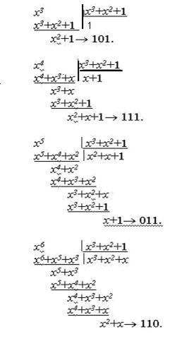 Вторая строка матрицы G (x)= x, поэтому G (x) *x 3 = x 4. Деление на образующий многочлен даёт для этой строки остаток 111.