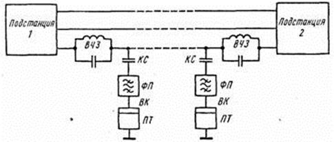 Пункт телемеханики ПТ соединяется с ВЛ высокочастотным кабелем ВК. Чтобы исключить влияние высокого напряжения линии на аппаратуру телемеханики, ПТ отделяется от ВЛ конденсаторами связи КС (для ВЛ напряжением 110 кВ емкость КС равна 2200 пкФ), которые представляют большое сопротивление для переменного тока частотой 50 Гц, передаваемого по ВЛ, и малое сопротивление для высокочастотных сигналов телемеханики.