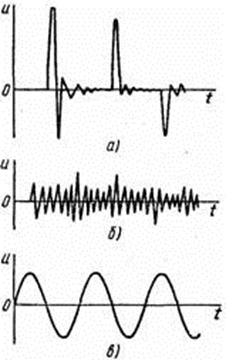 По форме аддитивные помехи можно разделить на сосредоточенные во времени или импульсные (рис. 7.2, а), флуктуационные или гладкие (рис. 7.2, б) и гармонические или сосредоточенные по частоте (рис. 7.2, в).