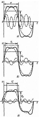 На рис. 7.3, а показано воспроизведение импульса прямоугольной формы тремя гармониками (1, 3 и 5-й) и постоянной составляющей. Амплитудно-частотные искажения изменяют амплитуду импульса и несколько искажают его форму (рис. 7.3, б).
