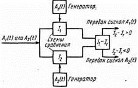 Идея построения идеального приемника заключается в следующем. Зная, какие сигналы должны быть переданы, например A 1(t) и A 2(t), и имея их образцы, создаваемые генераторами (рис. 7.5), сравнивают полученные сигналы по очереди с этими образцами и, вычисляя энергию разности принятого сигнала и образца этих сигналов, относят принятый сигнал к тому образцовому сигналу, для которого эта разность минимальна.