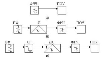 Приемники сигналов с амплитудной модуляцией. Структурная схема такого приемника показана на рис. 7.6, б. Приемник состоит из полосового фильтра ПФ, детектора Д, фильтра нижних частот ФНЧ и порогового устройства ПОУ. Оптимальная полоса высокочастотного входного полосового фильтра с двумя боковыми частотами