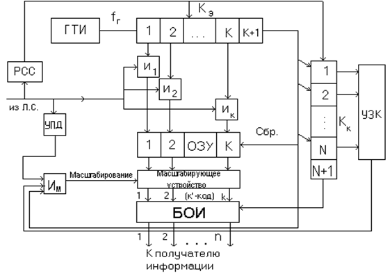 Поступающая вслед за синхронизирующим сигналом кодовая комбинация первого измерительного канала записывается через схемы совпадения И1, …, Ик в оперативное запоминающее устройство ОЗУ. При совпадении двух условий – отсутствии искажений и выбранном оператором канале №1 – на (к+1) такте работы коммутатора элементов кода Кэ информация с ОЗУ поступает в масштабирующее устройство. Это устройство преобразует номер отсчёта АЦП в значение телеизмеряемой величины в технические единицы её измерения, что делает удобным её считывание оператором с блока отображения информации (БОИ).