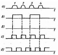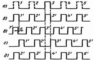 На рис. 8.7, а показана принятая на ведомой стороне, в качестве которой используется, например, КП, последовательность импульсов, поступивших с ПУ, а на рис. 8.6, б, в – импульсы, снятые после формирователя на КП, но еще не поступившие на делитель частоты импульсов.