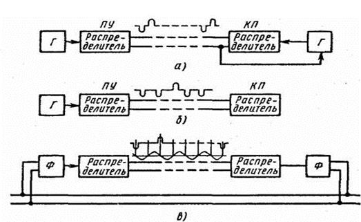 Циклическая синхронизация (рис. 8.4, а). Импульсы движения коммутаторов (или распределителей) ПУ и КП поступают от генераторов Г, частота генерации которых должна быть тождественно равной. Так как практически невозможно сделать два генератора, которые генерировали бы строго одинаковую частоту, то через некоторое время после включения импульсы движения коммутаторов на ПУ и КП не будут совпадать.