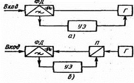 Управляющий элемент УЭ преобразует рассогласование с ФД в управляющее воздействие либо непосредственно на генератор, изменяя фазу его синусоидальных колебаний (рис. 8.5, а), либо на преобразователь П, где происходит подстройка фазы сформированных импульсов (рис. 8.5, б).