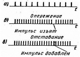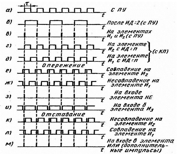 Принцип синфазирования заключается в следующем. Если частота импульсов на КП опережает частоту импульсов, генерируемых на ПУ, то из серии импульсов, приходящих на делитель КП, вычитается один импульс (рис. 8.6, б). Если же частота импульсов на КП отстает, то к ней добавляется один импульс (рис. 8.7, в, где дополнительный импульс обозначен пунктиром). Это вычитание и добавление импульсов может производиться многократно, пока частоты импульсов движения на ПУ и КП не совпадут.