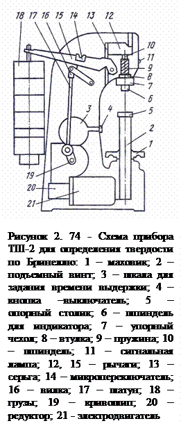 Для определения твердости по Бринеллю применяют специальные приборы, которые должны удовлетворять требованиям ГОСТ 2377 – 79. На рис. 2.74 показана схема одного из них, типа ТШ – 2, широко используемого в лабораторной практике.