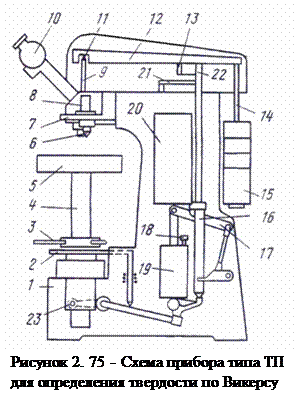 Приборы для измерения твердости по Викерсу должны соответствовать требованиям ГОСТ 23677 – 79. Схема прибора ТП показана на рис. 2.75. Прибор смонтирован на станине 1. Образец помещают на опорный столик 5. Нагрузка прилагается к индентору 6 через установленный на призмах 11 рычаг 12 (с отношением плеч 1:25) и промежуточный шпиндель 9, постоянно прижатый двумя пружинами к призме рычага. В спокойном состоянии рычаг 12 опирается на штырь 13. На длинном плече рычага имеется подвеска 14 для установки сменных грузов 15. Рычаг с подвеской без сменных грузов дает минимальную нагрузку 50 Н. Шпиндель 8 с индентором и измерительный микроскоп 10 смонтированы на поворотной головке, которая перемещается рукояткой 7.