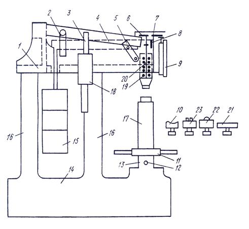 Существует несколько типов приборов для измерений твердости по Роквеллу, но принципиальные схемы их работы аналогичны. На рис. 2.77 дана схема прибора типа ТК. На станине 14 с одной стороны расположены две стойки 16, которые поддерживают поперечину 1. С другой стороны в направляющей втулке 13 со шпонкой 12 помещен подъемный винт 11, на котором устанавливают в зависимости от формы образца различные опорные столики 21 – 23 и 10. Винт со столиком и образцом поднимают вращением маховичка 11. Предварительную нагрузку к образцу прикладывают цилиндрической пружиной 19, действующей непосредственно на шпиндель 20. Грузовой рычаг второго рода 4, расположенный на поперечине 1, имеет опоры на призме 8. К длинному плечу рычага подвешивают грузы 15. В нерабочем положении прибора рычаг опирается на подвеску 2, и нагрузка на шпиндель не действует. Для приложения основной нагрузки освобождают рукоятку 5. При этом подвеска 2 вместе с рычагом 4 плавно опускается, и последний действует на шпиндель. Рычаг опускается плавно благодаря масляному амортизатору 18, позволяющему регулировать скорость приложения основной нагрузки вращением штока 3. Соотношение плеч у грузового рычага 1:20, и поэтому действительный вес сменных грузов в 20 раз меньше их условного веса.