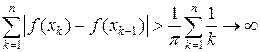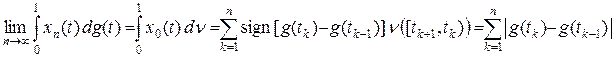 . Построим последовательность непрерывных функций xn таких, что | xn (t)| £ 1 и xn (t) ® x 0(t), где x 0(t) = sign [ g (tk) – g (tk – 1)] для tk – 1 < t < tk. В силу леммы 5.1 непрерывной слева функции g (t) соответствует s -аддитивный заряд n на [0, 1], поэтому