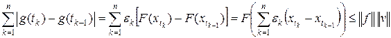 . Согласно теореме Хана – Банаха, функционал f может быть продолжен на все пространство с сохранением нормы. Пусть F – такое продолжение. Тогда определено значение F (xx). Покажем, что функция g (x) = F (xx) искомая. Возьмем произвольное разбиение отрезка [0, 1], 0 = t 0 < t 1 < ¼ < tn < 1, и составим сумму