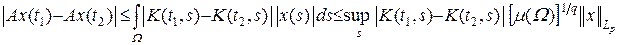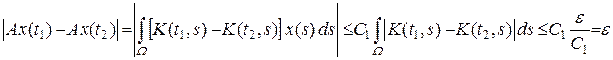 Доказательство. Проверим выполнение условий 1) и 2) теоремы 8.1. Условие 1) следует из ограниченности функции K (t, s). В силу равномерной непрерывности функции K (t, s) для любого e > 0 существует d > 0 такое, что для любых t 1 – t 2 Î