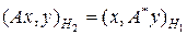 Определение 9.1. Сопряженным оператором к оператору A : H 1 ® H 2, где H 1 и H 2 – гильбертовы пространства, называется оператор A*: H 2 ® H 1 такой, что для любых x Î H 1, y Î H 2 выполняется равенство