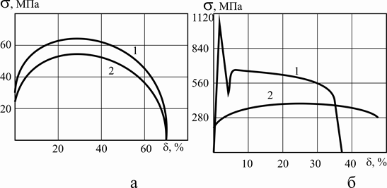 Рисунок 2. 67 - Кривые напряжение – деформация при динамической (1) и статической деформации (2): а – для алюминия (Ямада, Котерезава);